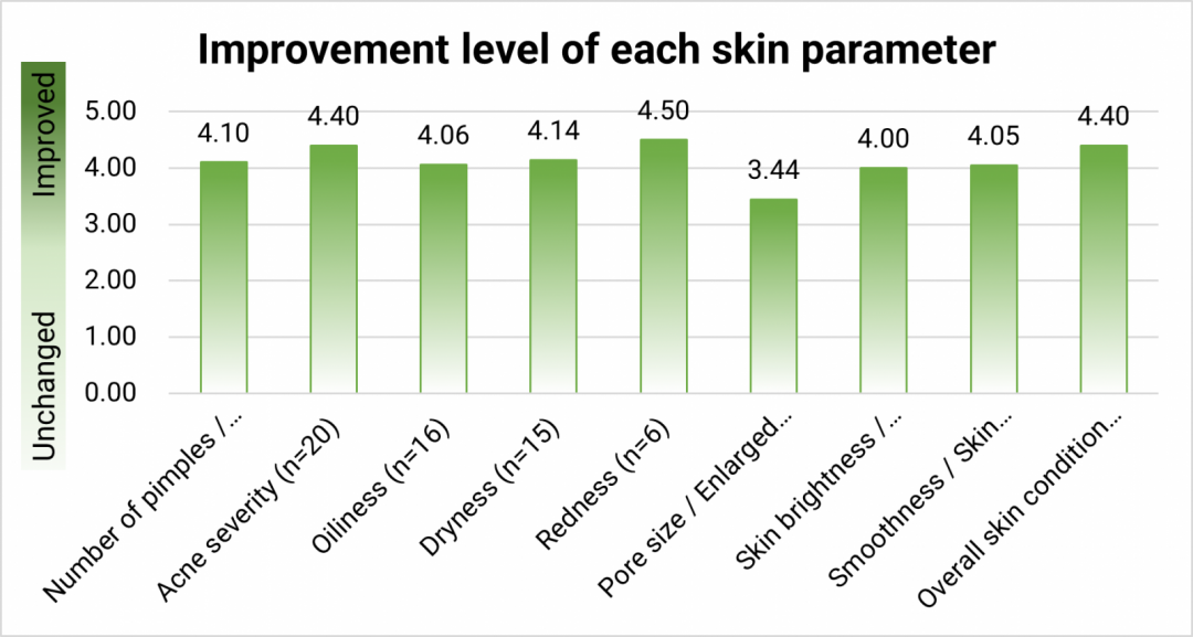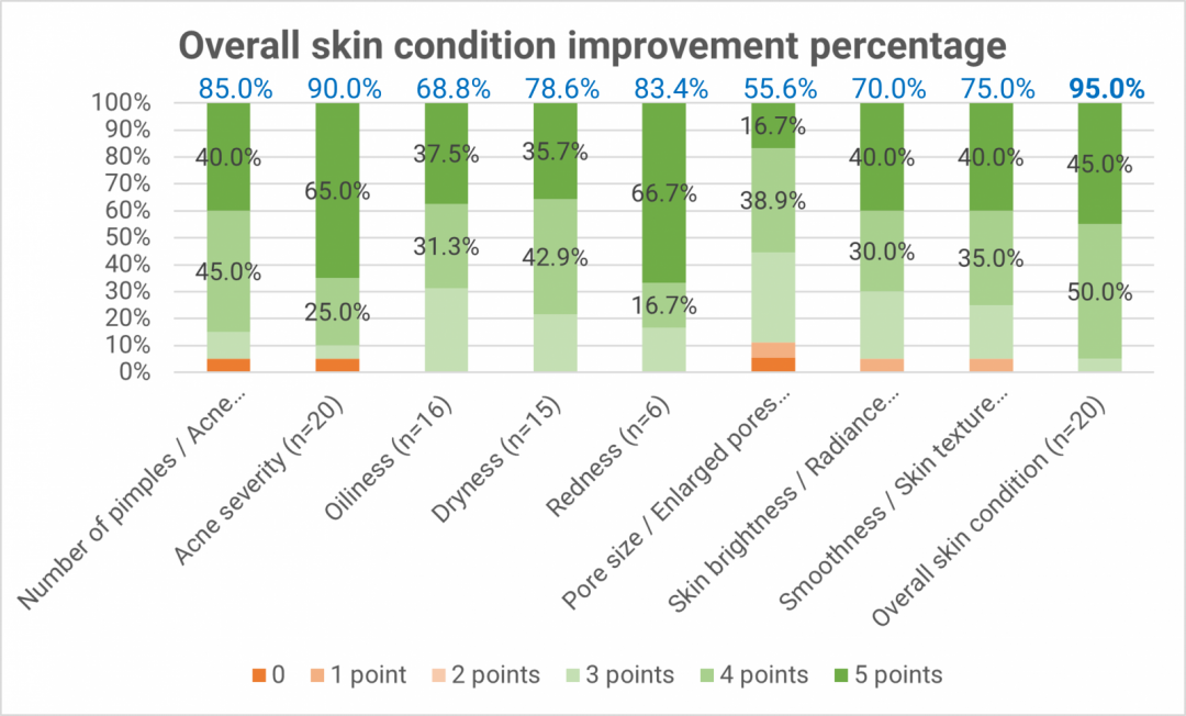 - 55% of users: noticed smaller pores and fewer blackheads (Improved degree: >80%)