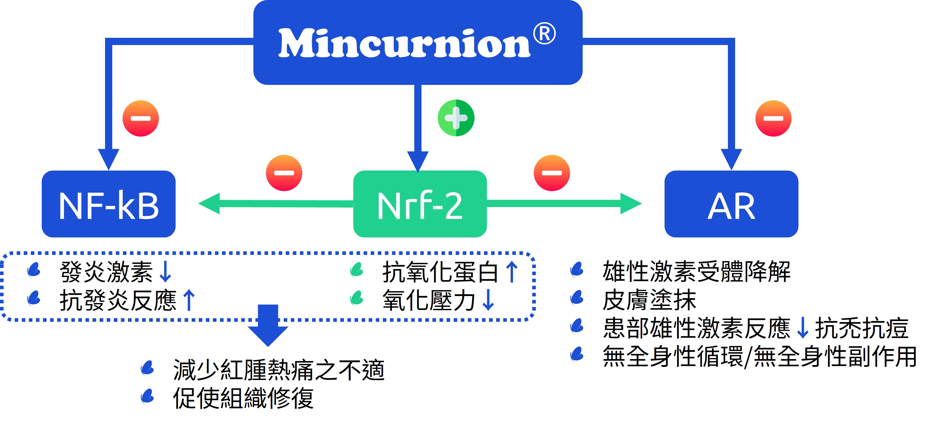 - 細胞實驗確認Mincurnion®可抗油脂分泌、抑制發炎、抗氧化,並降解雄性激素受體。