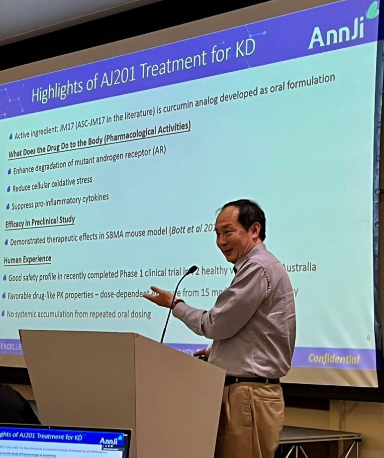 聚集全球最多甘迺迪氏症醫學、研究專家及病友協會之『2022甘迺迪氏症協會國際會議』 (2022 KDA Conference),於2022年11月9-11日在美國加州聖地牙哥舉辦,這是2019年以來KDA首次實體及線上並行開會,KDA特別邀請安基之研發副總陳耀武博士,介紹AJ201 及即將開始收案的二期臨床試驗。現場及線上參與的全球病友及醫學專家,反應熱烈,引頸期盼加入/参與臨床試驗,期許AJ201為甘迺迪氏症病患,帶來新治療希望的曙光。