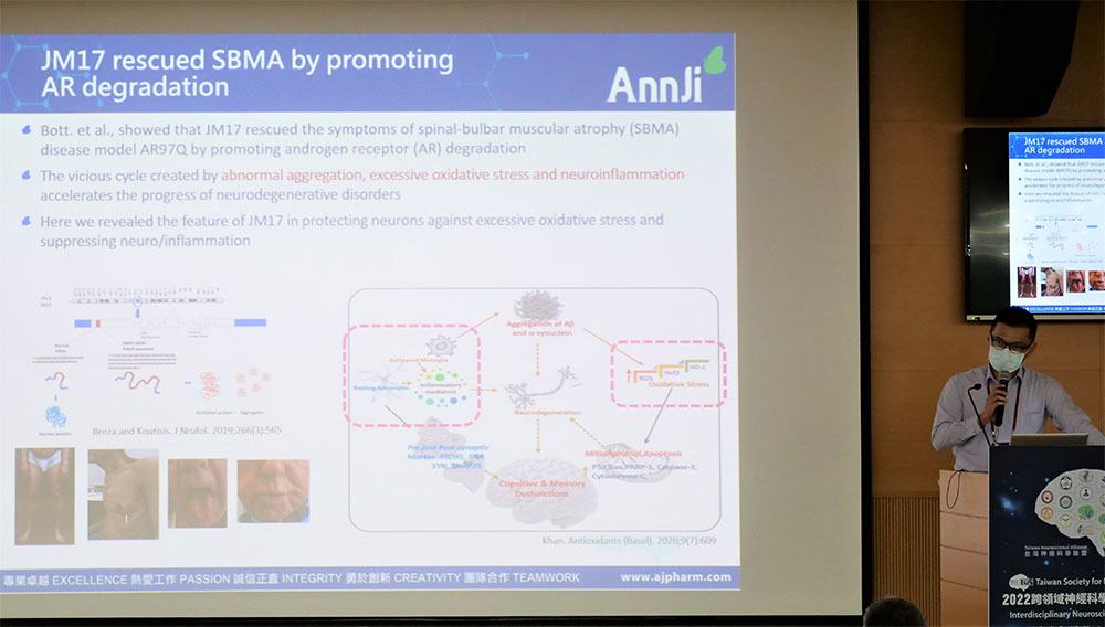 2022年台灣神經科學研究的最大盛會—「跨領域神經科學國際研討會」於9月2日至4日,在林口長庚永慶科學園區舉辦,為促進跨學科對話和創新合作,台灣神經科學聯盟(Taiwan Neuroscience Alliance, TNA)聚集了台灣 16 個與神經科學相關的學會和國際知名科學家,就神經科學之基礎、臨床、認知與工程多元領域,分享研究主題、技術平台與研究成果。本次研討會從超過160個投稿中,僅篩選出45位研究主題,分三天各十五位上台演說,安基生技新藥(安基)由臨床前研究暨轉譯醫學處資深研究員白宗彬博士,以「AJ201研發成果-JM17作為甘迺迪式症與神經退化性疾病的新療法」為主題,就活性藥物成分-JM17,各項藥理機轉之實驗結果發表演說,報告研發團隊多年努力成果,這次的研究演說,廣受本次與會神經科/醫學專家一致贊同與嘉許,並贏得本次大會「最佳演說報告獎」,能在眾多演說中脫穎而出,此份尊榮實屬不易。